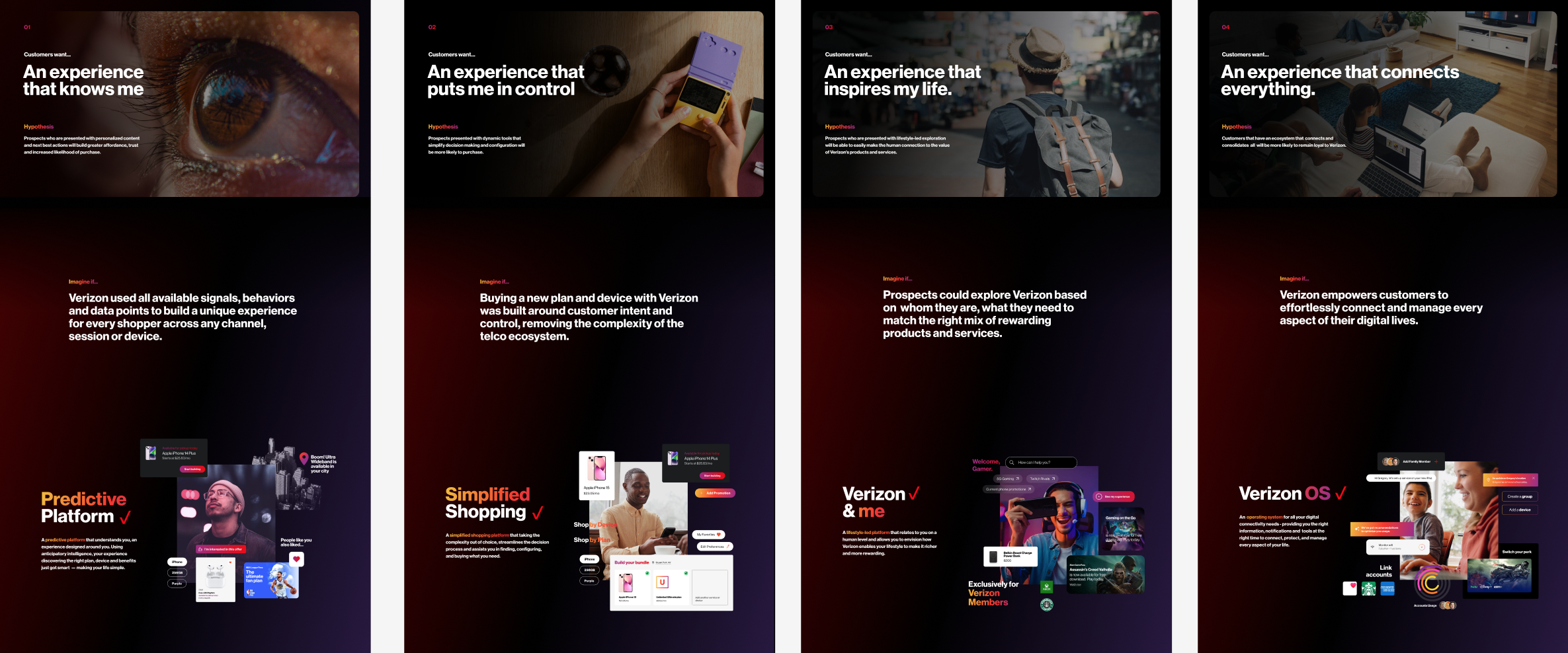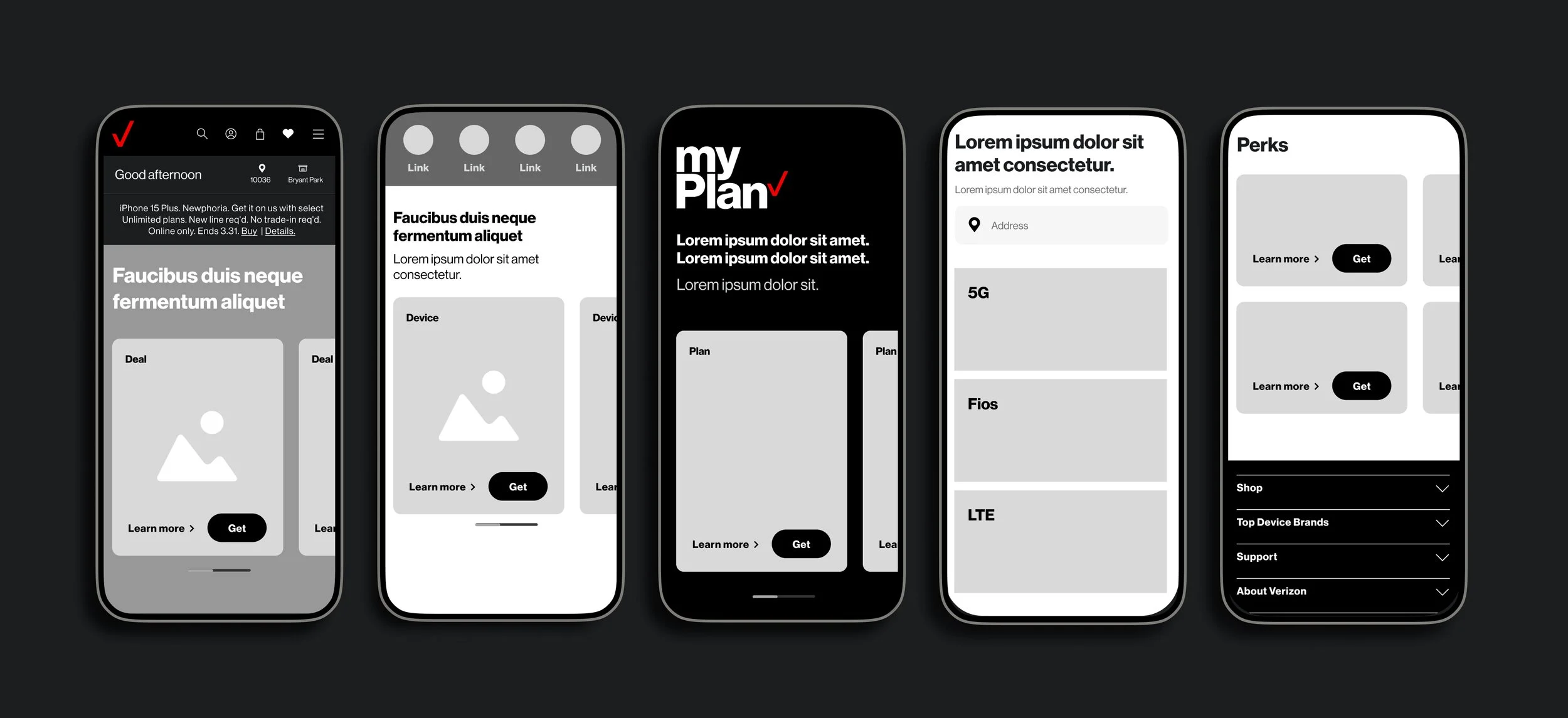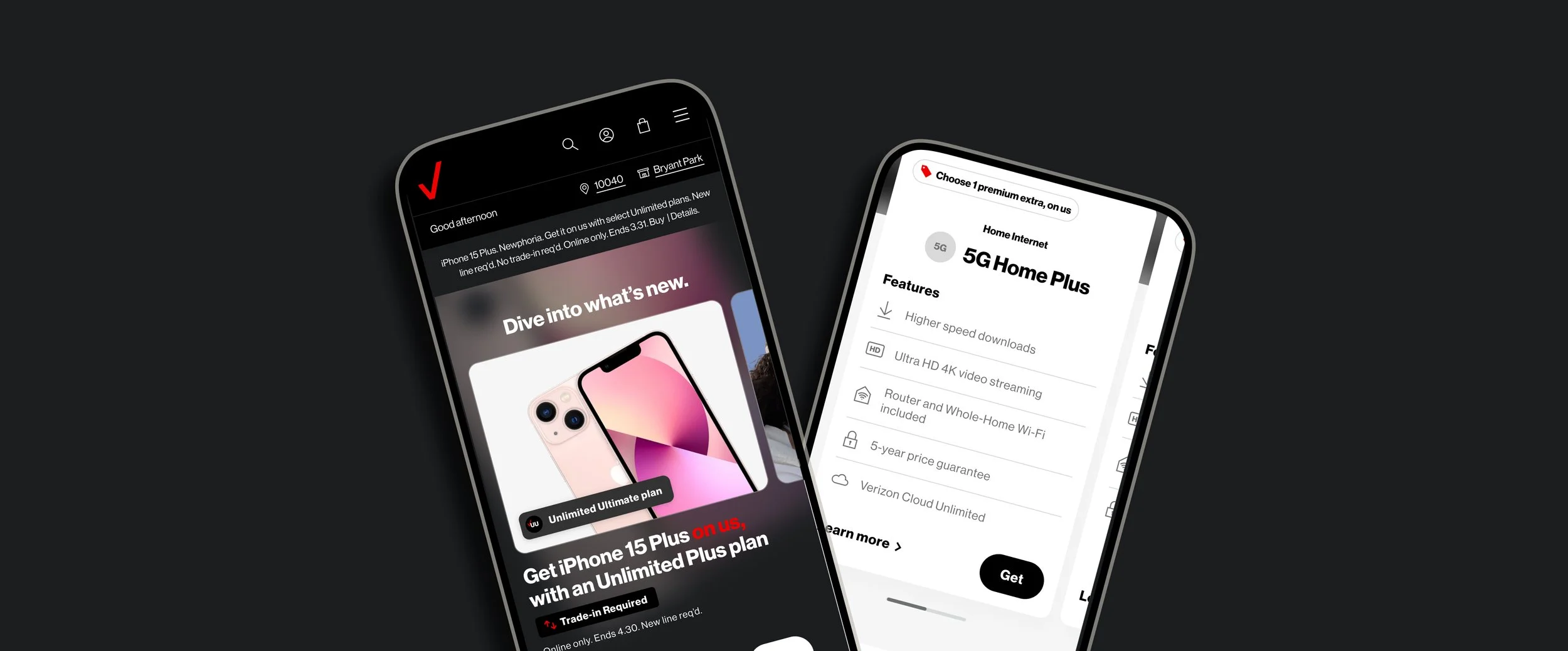 This project pushed me to navigate multiple constraints, moving at an extremely rapid and iterative pace while adhering to a complex enterprise design system and brand guidelines. The goal was to push the visual direction while still maintaining the same brand essence Verizon was built on. This required me to rethink design patterns, add new components to our own internal version of their design system, and ensure consistency was achieved across other pods working on different goals.