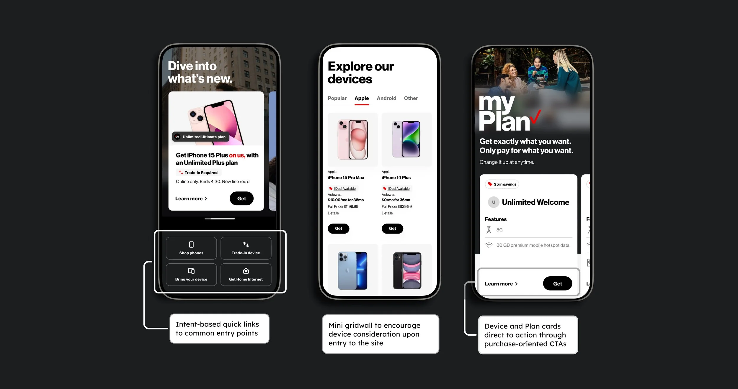 Users arrive with different goals, whether it’s shopping for a phone, trading in a device, or exploring plans. We prioritized clear, intent-based access points to help users quickly self-select the path that matches their needs.